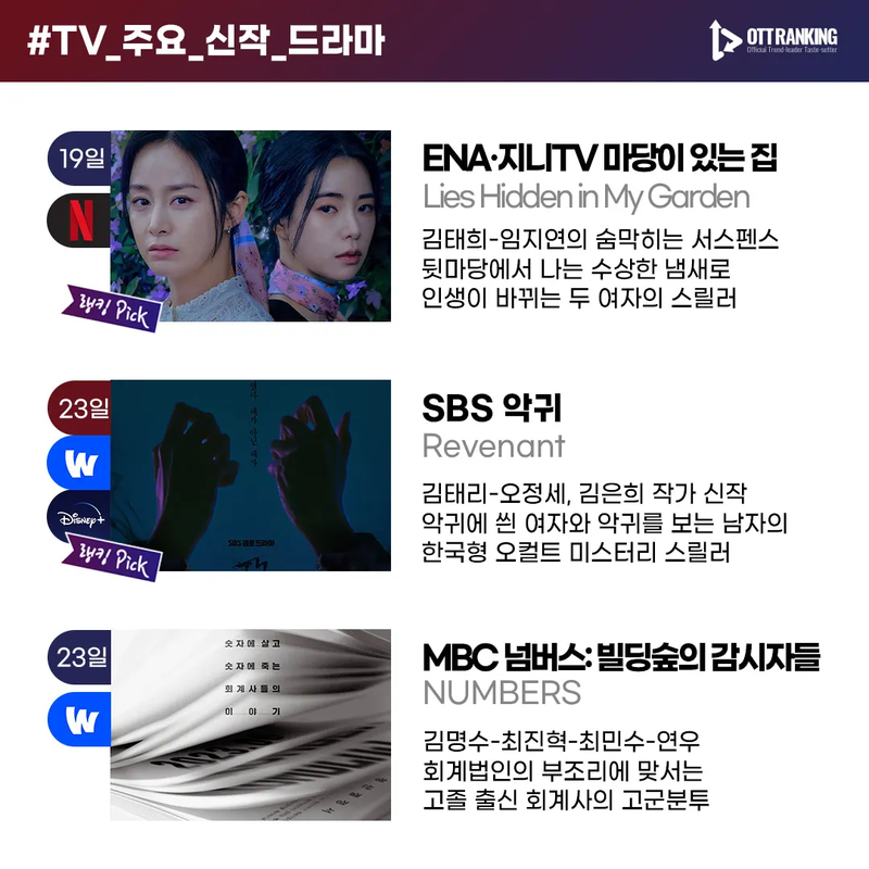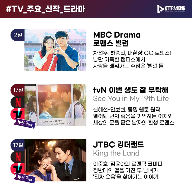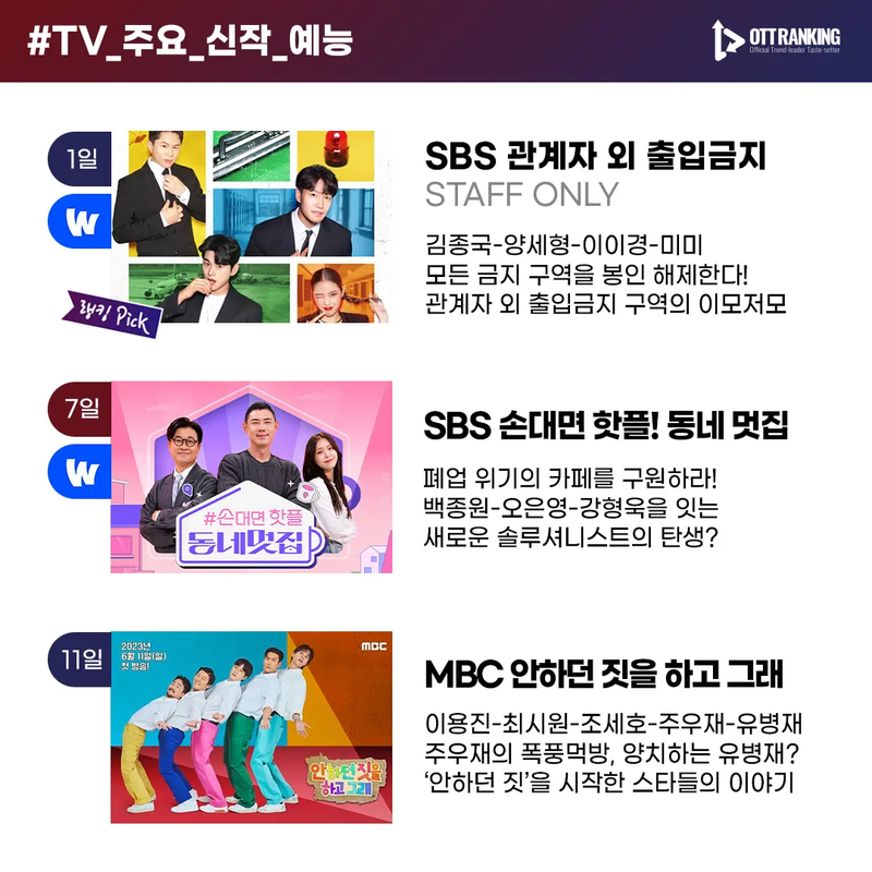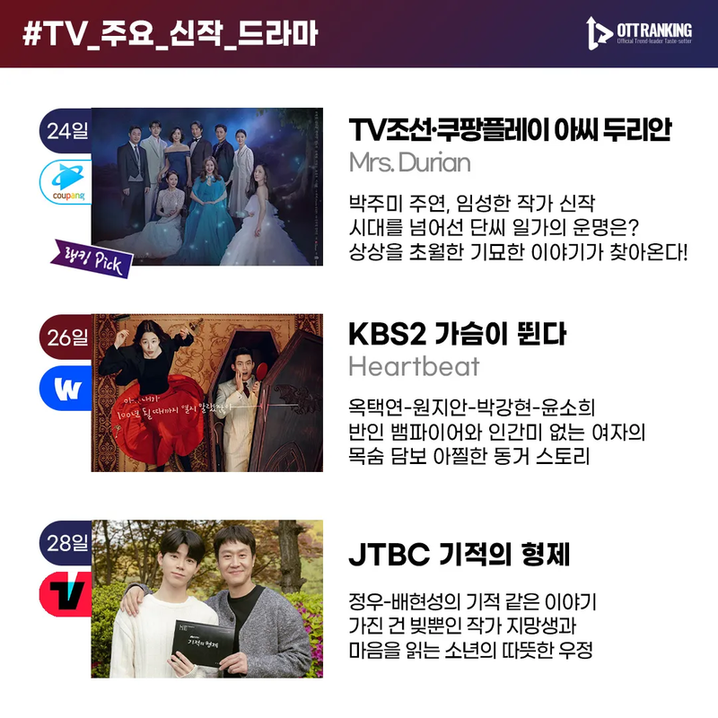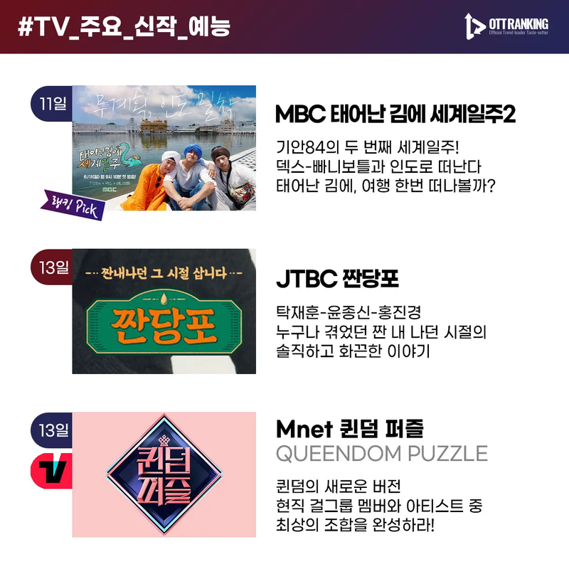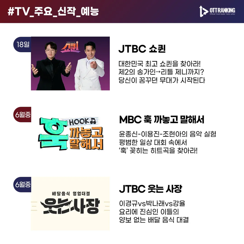 [매거진] 6월 TV 신작, 골라보는 재미 가득! Picture Member for 1 year 1 month Real name Sellin Kim Bio 좋은 콘텐츠는 언제나 일상 속 소통과 휴식의 일부분이 됩니다. 누구나 편안하고 즐길 수 있는 콘텐츠로 일상 속 소소한 즐거움을 선사하겠습니다. 입력 2023-06-01 18:45 수정 2025-04-09 18:38 6월 TV 드라마-예능 주요 신작 탄탄한 출연진 라인업! 볼거리 가득, 골라보는 재미 Picture Member for 1 year 1 month Real name Sellin Kim Bio 좋은 콘텐츠는 언제나 일상 속 소통과 휴식의 일부분이 됩니다. 누구나 편안하고 즐길 수 있는 콘텐츠로 일상 속 소소한 즐거움을 선사하겠습니다. Previous [매거진] 6월 개봉 예정 영화, 풍성한 기대작 Next [매거진] 6월 OTT 주요 신작, 풍성하고 색다른 장르 관련기사 Romance in 21st Century Grand Prince’s Wife Sparks BuzzElena NovakDrama Review 2025-11-13 19:26 [OTT 한줄평] 영화 '3일의 휴가'Jane RimOTT Online Line Review 2024-03-15 15:41 [OTT 한줄평] 영화 '비밀'Jane RimOTT Online Line Review 2024-03-15 15:40 [OTT 한줄평] 영화 '뜨거운 피'Jane RimOTT Online Line Review 2024-03-15 15:38 [첫방D-DAY] “지금까지 이런 코미디는 없었다”, 이병헌 감독✕류승룡✕안재홍의 ‘닭강정’ (넷플)Jane RimContents 2024-03-15 15:30 [위클리 OTT 랭킹] 3월 2주차 디즈니·쿠팡·왓챠·애플 TOP3 – 스릴과 코믹 사이Jane RimWeekly Top3 2024-03-15 13:49 [데일리 OTT 랭킹] 3/15 웨이브·티빙·넷플 TOP10 – ‘나는 SOLO’ 과몰입의 날안현정Daily Top10 2024-03-15 10:34 [오늘의 OTT 통합 랭킹] 3월 15일 – 설레거나 스릴 있거나Jane RimOTT All Rankings 2024-03-15 10:31 [OTT 영화 랭킹] 3/14 넷플·티빙·웨이브 – 동화 같은 이야기Jane RimMovie Ranking 2024-03-14 15:18 Romance in 21st Century Grand Prince’s Wife Sparks Buzz [OTT 한줄평] 영화 '3일의 휴가' [OTT 한줄평] 영화 '비밀' [OTT 한줄평] 영화 '뜨거운 피' [첫방D-DAY] “지금까지 이런 코미디는 없었다”, 이병헌 감독✕류승룡✕안재홍의 ‘닭강정’ (넷플) [위클리 OTT 랭킹] 3월 2주차 디즈니·쿠팡·왓챠·애플 TOP3 – 스릴과 코믹 사이 [데일리 OTT 랭킹] 3/15 웨이브·티빙·넷플 TOP10 – ‘나는 SOLO’ 과몰입의 날 [오늘의 OTT 통합 랭킹] 3월 15일 – 설레거나 스릴 있거나 [OTT 영화 랭킹] 3/14 넷플·티빙·웨이브 – 동화 같은 이야기 [데일리 OTT 랭킹] 3/14 넷플·티빙·웨이브 TOP10 – 사탕보다 달콤한 [오늘의 OTT 통합 랭킹] 3월 14일 – ‘눈물의 여왕’, 흥행의 제왕! [매거진] 풋풋한 사랑으로 가득 채운 화이트데이 OTT 추천작