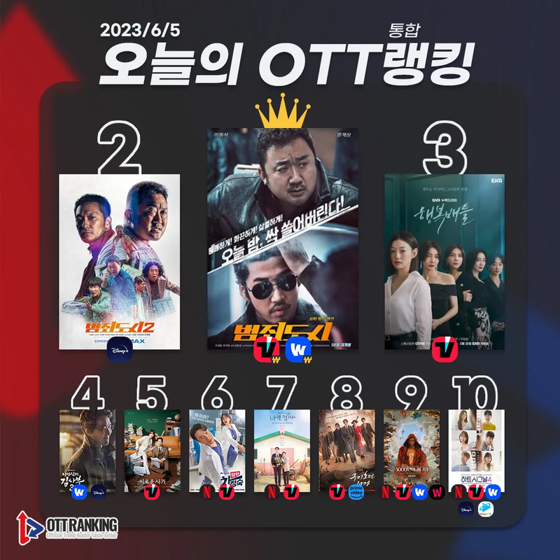 6월 5일 [오늘의 OTT 통합 랭킹] TOP3는 △범죄도시(THE OUTLAWS) △범죄도시2(The Roundup) △행복배틀(Battle for Happiness)이다. 이어 △낭만닥터 김사부 시즌3(Dr. Romantic3) △이로운 사기(Delightfully Deceitful) △닥터 차정숙(Doctor Cha) △나쁜엄마(The Good Bad Mother) △구미호뎐1938(Tale of the Nine Tailed) △3000년의 기다림(Three Thousand Years of Longing) △하트시그널4(Heart Signal 4) 순으로 차트인했다.