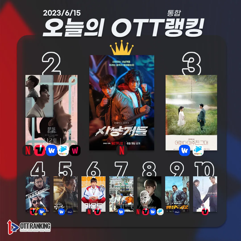 6월 15일 [오늘의 OTT 통합 랭킹] TOP3는 △사냥개들(BLOODHOUNDS) △상견니(Someday or One Day) △어쩌다 마주친, 그대(Run Into You)다. 이어 △범죄도시(THE OUTLAWS) △낭만닥터 김사부 시즌3(Dr. Romantic3) △카운트(Count) △태어난 김에 세계일주2 △가면의 여왕(Queen Of Mask) △범죄도시2(The Roundup) △이로운 사기(Delightfully Deceitful) 순으로 차트인했다.