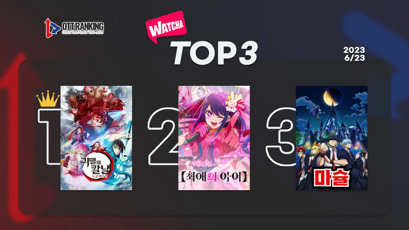 왓챠(WATCHA)의 일본 콘텐츠 열풍은 식을 줄을 모른다. 고토게 코요하루의 만화 『귀멸의 칼날』을 원작으로 한 <귀멸의 칼날: 도공 마을편 Demon Slayer: Kimetsu no Yaiba Swordsmith Village Arc>이 1위를 지켰고, 최근 SNS를 통해 챌린지 열풍이 불고 있는 애니메이션 <최애의 아이 Oshi no Ko>는 2위다. 작품의 오프닝 곡이자 챌린지의 주인공 ‘아이돌’은 빌보드 재팬 핫100 1위에 오르는 등 뜨거운 인기를 자랑 중이다.