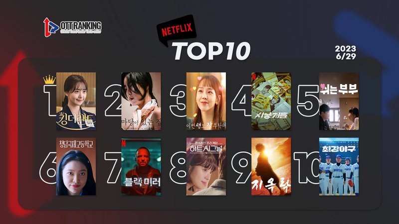 6위는 넷플릭스·웨이브 오리지널 <청담국제고등학교>다. 고등학교에서 벌어지는 여고생들의 치열한 심리 싸움으로 몰입감 넘치는 전개를 선보였던 이 작품은 지난 28일 종영과 함께 전 회차 ‘몰아보기’가 가능해진 만큼 한동안 차트 내 존재감을 발휘할 전망이다. 유일한 외화인 오리지널 시리즈 <블랙 미러 시즌6>은 7위에 올랐고, 8위부터 10위는 채널A <하트시그널4>, 일본 애니메이션 <지옥락>, JTBC <최강야구> 순으로 차트인했다.
