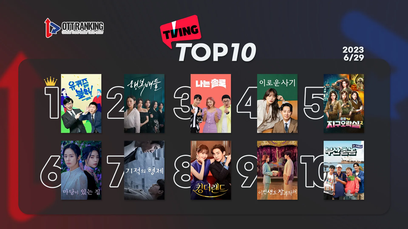 티빙(TVING) 1위는 tvN <유 퀴즈 온 더 블럭>(이하 유퀴즈)이다. 지난 2018년 첫선을 보인 이 작품은 약 5년간 따뜻하고 솔직한 이야기를 전하며 안방극장을 훈훈한 웃음으로 물들였다. 최근 200회를 맞이한 <유퀴즈> 측은 “이렇게 큰 사랑은 ’자기님’들의 이야기와 그 이야기들이 주는 공감의 힘 덕분이다. 잔잔한 호수에 들어간 조약돌같이, 자극적인 이야기는 없지만 모든 분들에게 웃음과 감동을 전할 수 있는 프로그램이 되도록 최선을 다하겠다”고 소감을 전했다.