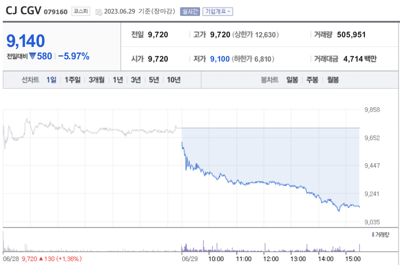 이렇다 보니 우리나라 대표 극장인 CJ CGV 주가 역시 하락세를 거듭하고 있다. 29일 CJ CGV의 주가는 전일 9,720원 대비 580원(-5.97%) 하락하며 시장 종가 9,140원을 기록했다. 지난 23일 1만원 아래로 떨어지면서 26~27일 이틀 연속 하락세가 이어졌고, 28일 잠시 반등하더니 29일 다시 큰 폭으로 하락한 것이다. CJ CGV 주가가 1만원을 밑돈 것은 2018년 11월 이후 처음 있는 일이다. 심지어 이는 지난 2004년 최초 상장 당시 공모가(2만5,000원)의 절반도 되지 않는 가격이다.
