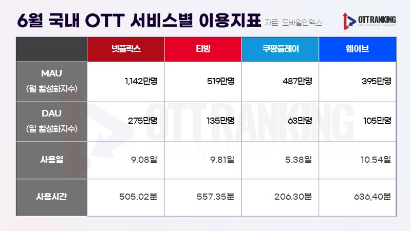 이런 한편 하루 이용자 수를 나타내는 DAU(일간활성화지수)의 경우 순위가 조금 달랐다. 6월 국내 OTT의 평균 DAU는 넷플릭스가 275만 명으로 1위였고, 티빙(135만 명)과 웨이브(105만 명)가 뒤를 이었다. MAU에서 웨이브를 크게 제쳤던 쿠팡플레이는 DAU의 경우 63만 명으로 오히려 40만 명 넘게 낮은 수치를 기록했다.