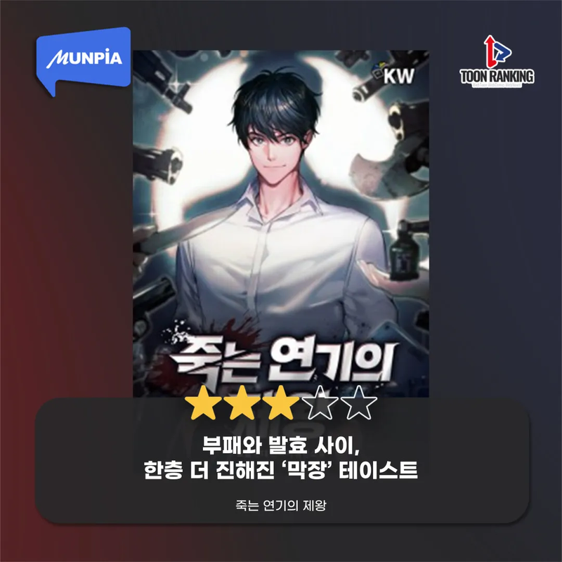 [웹소설 한줄평] 문피아 '죽는 연기의 제왕' 입력 2023-09-08 01:07 수정 2025-08-01 13:47 문피아, 카카오 <죽는 연기의 제왕> ★★★ 부패와 발효 사이, 한층 더 진해진 '막장' 테이스트 Previous [웹툰 한줄평] 네이버 웹툰 ‘A.I. 닥터’ Next [웹소설 한줄평] 문피아 '시간을 달리는 소설가' 관련기사 Romance in 21st Century Grand Prince’s Wife Sparks BuzzElena NovakDrama Review 2025-11-13 19:26 [OTT 한줄평] 영화 '3일의 휴가'Jane RimOTT Online Line Review 2024-03-15 15:41 [OTT 한줄평] 영화 '비밀'Jane RimOTT Online Line Review 2024-03-15 15:40 [OTT 한줄평] 영화 '뜨거운 피'Jane RimOTT Online Line Review 2024-03-15 15:38 [첫방D-DAY] “지금까지 이런 코미디는 없었다”, 이병헌 감독✕류승룡✕안재홍의 ‘닭강정’ (넷플)Jane RimContents 2024-03-15 15:30 [위클리 OTT 랭킹] 3월 2주차 디즈니·쿠팡·왓챠·애플 TOP3 – 스릴과 코믹 사이Jane RimWeekly Top3 2024-03-15 13:49 [데일리 OTT 랭킹] 3/15 웨이브·티빙·넷플 TOP10 – ‘나는 SOLO’ 과몰입의 날안현정Daily Top10 2024-03-15 10:34 [오늘의 OTT 통합 랭킹] 3월 15일 – 설레거나 스릴 있거나Jane RimOTT All Rankings 2024-03-15 10:31 [OTT 영화 랭킹] 3/14 넷플·티빙·웨이브 – 동화 같은 이야기Jane RimMovie Ranking 2024-03-14 15:18 Romance in 21st Century Grand Prince’s Wife Sparks Buzz [OTT 한줄평] 영화 '3일의 휴가' [OTT 한줄평] 영화 '비밀' [OTT 한줄평] 영화 '뜨거운 피' [첫방D-DAY] “지금까지 이런 코미디는 없었다”, 이병헌 감독✕류승룡✕안재홍의 ‘닭강정’ (넷플) [위클리 OTT 랭킹] 3월 2주차 디즈니·쿠팡·왓챠·애플 TOP3 – 스릴과 코믹 사이 [데일리 OTT 랭킹] 3/15 웨이브·티빙·넷플 TOP10 – ‘나는 SOLO’ 과몰입의 날 [오늘의 OTT 통합 랭킹] 3월 15일 – 설레거나 스릴 있거나 [OTT 영화 랭킹] 3/14 넷플·티빙·웨이브 – 동화 같은 이야기 [데일리 OTT 랭킹] 3/14 넷플·티빙·웨이브 TOP10 – 사탕보다 달콤한 [오늘의 OTT 통합 랭킹] 3월 14일 – ‘눈물의 여왕’, 흥행의 제왕! [매거진] 풋풋한 사랑으로 가득 채운 화이트데이 OTT 추천작