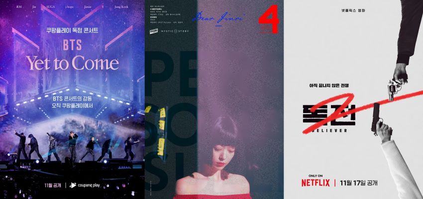 지난 2022년 10월 15일 부산에서 열린 방탄소년단(BTS) 콘서트 ‘Yet to Come’의 실황을 담은 영화. 화려한 불빛과 함성으로 가득 찼던 공연 외에도 멤버들 개개인의 모습을 담은 클로즈업 씬, 다채로운 앵글로 담은 히트곡 릴레이 무대와 현장의 뜨거운 열기가 함께 담길 예정. 또한 이 공연에서 최초 공개된 ‘달려라 방탄’ 퍼포먼스 또한 담겼다고 알려지며 전 세계 아미(A.R.M.Y, 방탄소년단 팬덤)들의 마음에 불을 지폈다. 특히 현재 방탄소년단의 몇몇 멤버들의 병역의 의무를 위해 군 복무 중인 만큼, 완전체인 방탄소년단의 모습을 볼 수 있을 것으로 기대를 모은다. 9일 공개.
