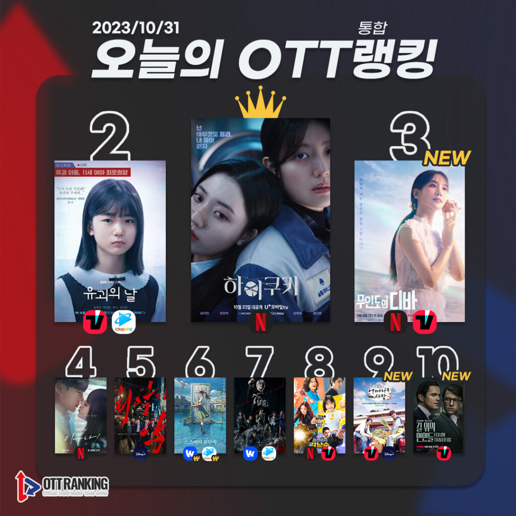 10월 31일 [오늘의 OTT 통합 랭킹] TOP3는 △하이쿠키(High Cookie) △유괴의 날(The Kidnapping Day) △무인도의 디바(Castaway Diva)다. 이어 △이두나!(Doona!) △최악의 악(The Worst of Evil) △스즈메의 문단속(Suzume) △7인의 탈출(The Escape of the Seven) △힘쎈여자 강남순(Strong Woman KangNamSoon) △어쩌다 사장3(Unexpected Business 3) △길 위의 연인들(Fellow Travelers) 순으로 차트인했다.