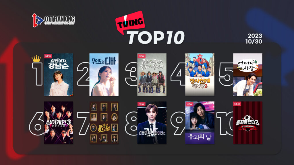 5위와 6위는 tvN <어쩌다 사장3>와 JTBC <싱어게인3>가 차지했고, 결승 생방송 무대만을 남겨둔 Mnet <스트릿 우먼 파이터2>는 8위를 기록했다. ‘조기축구 한일전’을 그리며 웃음과 감동을 모두 잡은 JTBC <뭉쳐야 찬다3>는 10위다. 이로써 티빙 차트에 든 예능 7작품 가운데 전작의 인기에 힘입어 새로운 이야기를 시작한 시즌제 예능이 무려 5작품을 차지했다.