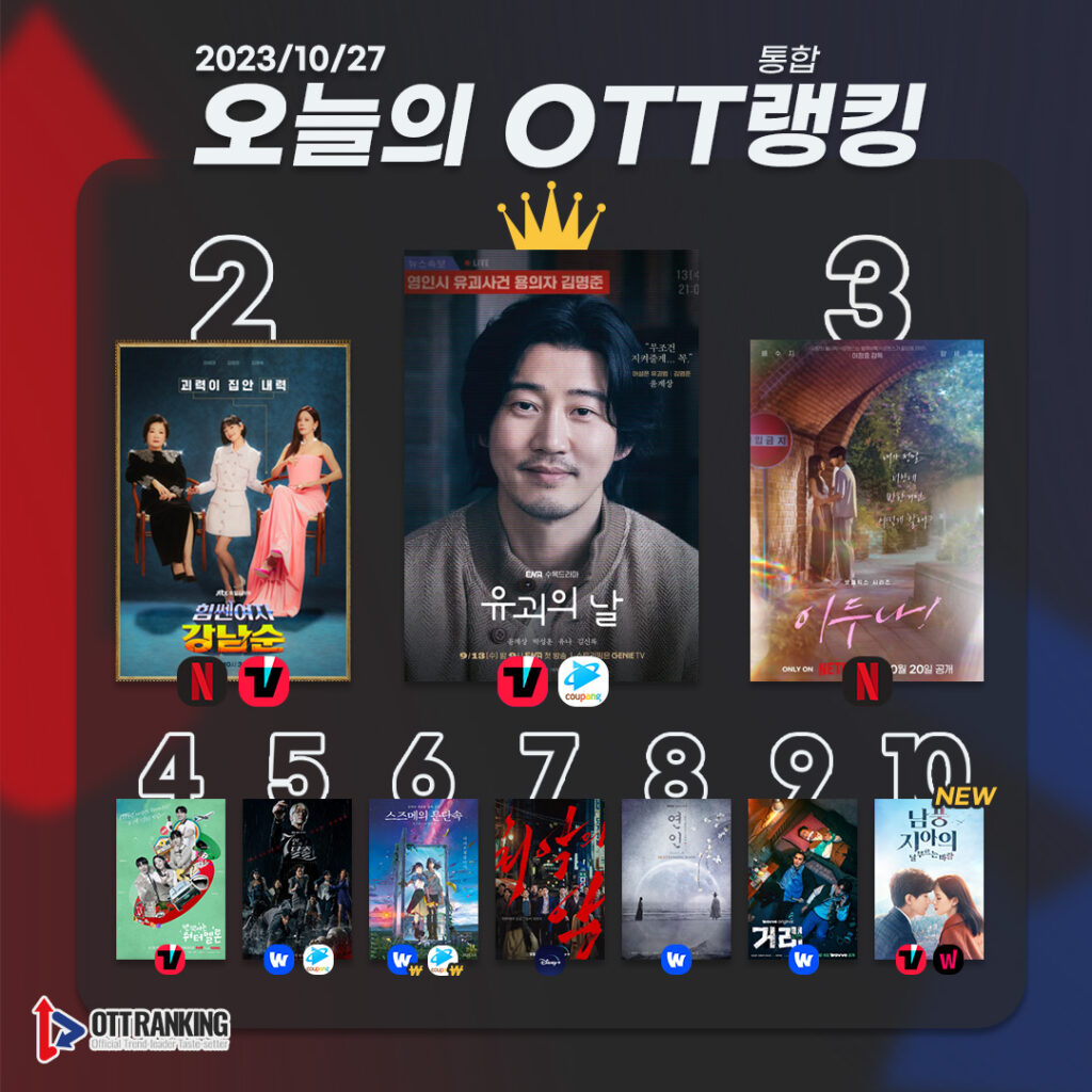 10월 27일 [오늘의 OTT 통합 랭킹] TOP3는 △유괴의 날(The Kidnapping Day) △힘쎈여자 강남순(Strong Woman KangNamSoon) △이두나!(Doona!)다. 이어 △반짝이는 워터멜론(Twinkling Watermelon) △7인의 탈출(The Escape of the Seven) △스즈메의 문단속(Suzume) △최악의 악(The Worst of Evil) △연인 파트2(My Dearest) △거래(The Perfect Deal) △남풍지아의: 널 부르는 바람(South Wind Knows) 순으로 차트인했다.