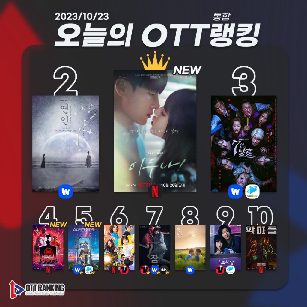 10월 23일 [오늘의 OTT 통합 랭킹] TOP3는 △이두나!(Doona!) △연인 파트2(My Dearest) △7인의 탈출(The Escape of the Seven)이다. 이어 △스파이더맨: 어크로스 더 유니버스(Spider-Man: Across the Spider-Verse) △스즈메의 문단속(Suzume) △힘쎈여자 강남순(Strong Woman KangNamSoon) △잠(Sleep) △연인 파트1(My Dearest) △유괴의 날(The Kidnapping Day) △악마들(Devils) 순으로 차트인했다.