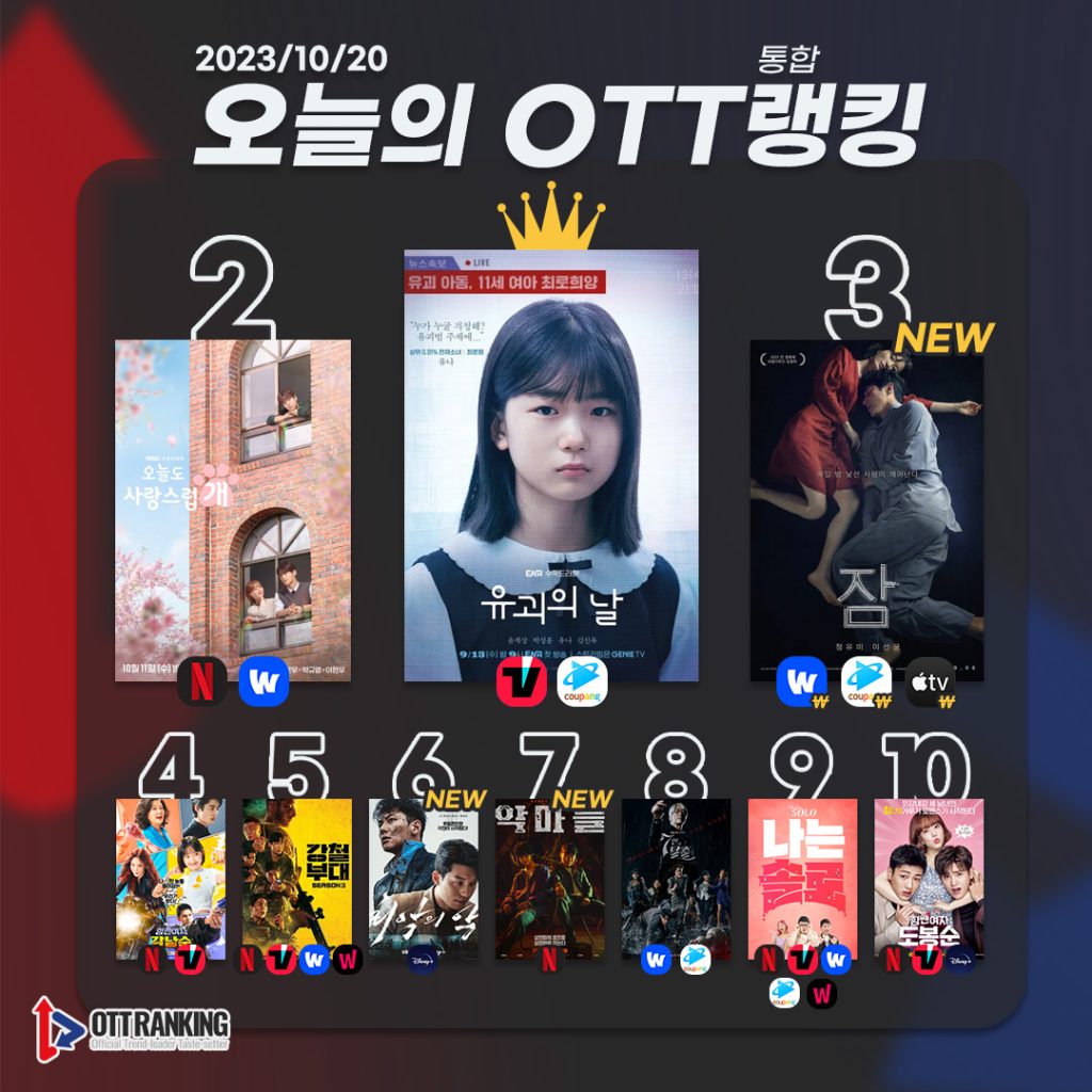 10월 20일 [오늘의 OTT 통합 랭킹] TOP3는 △유괴의 날(The Kidnapping Day) △오늘도 사랑스럽개(A Good Day to Be a Dog) △잠(Sleep)이다. 이어 △힘쎈여자 강남순(Strong Woman KangNamSoon) △강철부대3(The Iron Squad 3) △최악의 악(The Worst of Evil) △악마들(Devils) △7인의 탈출(The Escape of the Seven) △나는 SOLO(I'm SOLO) △힘쎈여자 도봉순(Strong Woman DoBongSoon) 순으로 차트인했다.
