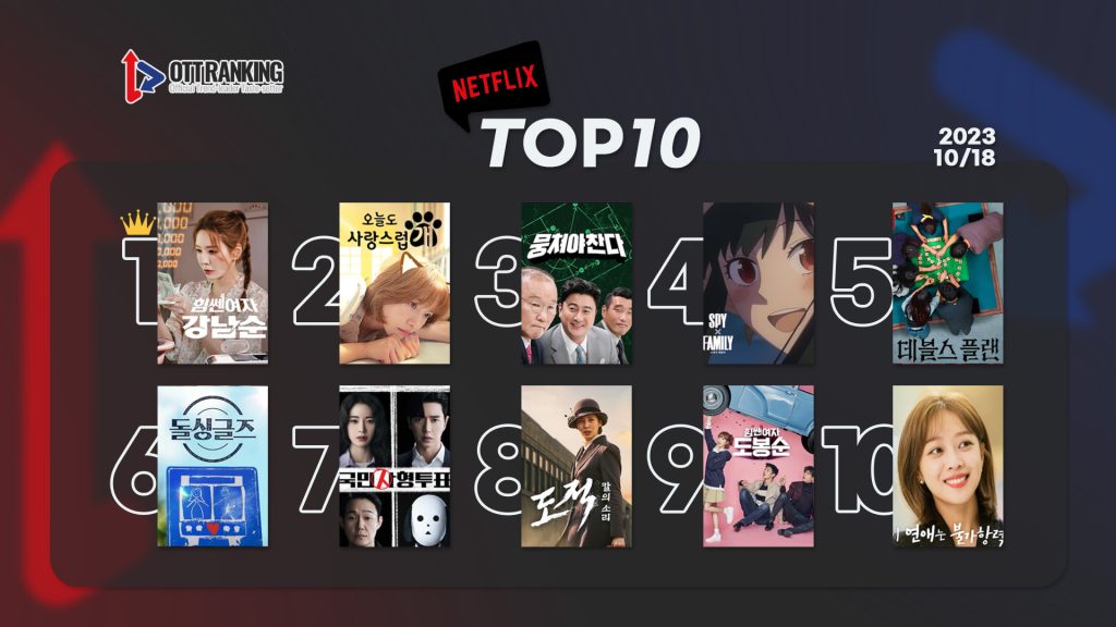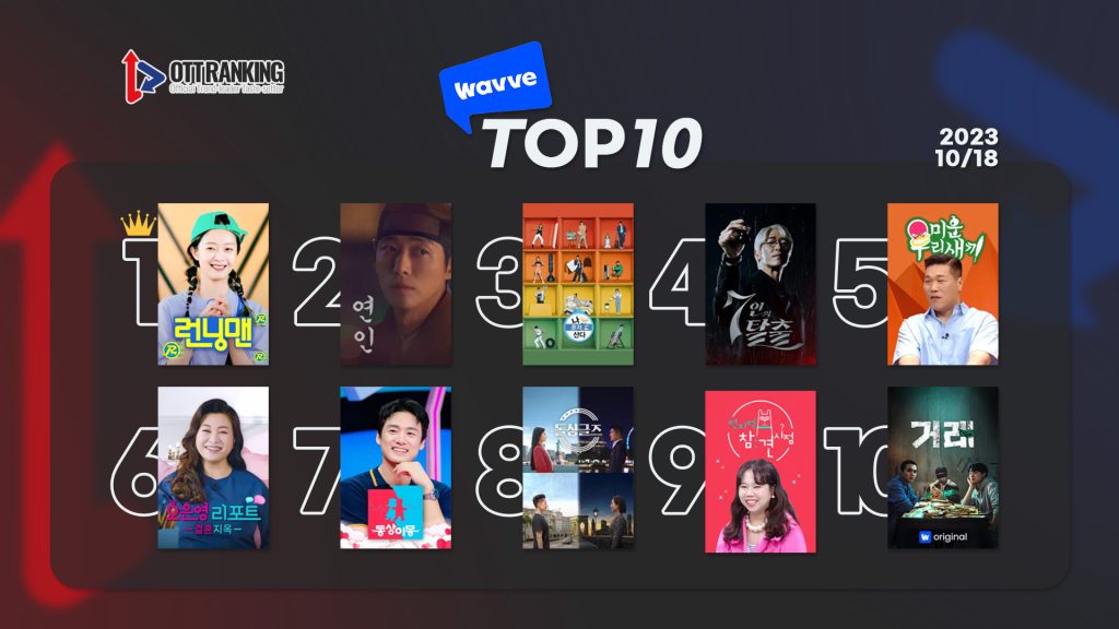 3위는 세 번째 시즌을 시작한 JTBC 축구 예능 <뭉쳐야 찬다>가 차지했고, 애니메이션 <스파이 패밀리>는 4위다. 5위에 오른 오리지널 <데블스 플랜>은 예능 콘텐츠 가운데 이례적으로 모든 에피소드 공개 후에도 꾸준한 성적을 보이고 있으며, 오리지널 시리즈 <도적: 칼의 소리>는 8위에서 차트 아웃을 준비 중이다.