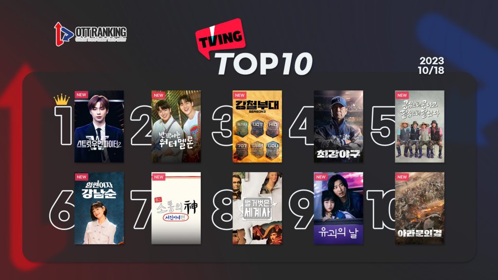 3위에는 채널A·ENA <강철부대3>가 올랐고, JTBC <최강야구>는 4위에서 시즌 막바지를 장식 중이다. tvN 새 예능 <콩 심은 데 콩 나고 팥 심은 데 팥 난다>는 5위로 꾸준한 성적을 보이고 있으며, ‘힘쎈’ 세계관의 확장으로 성공적인 스핀오프의 정석을 보여주고 있는 JTBC 토일극 <힘쎈여자 강남순>은 7위다.