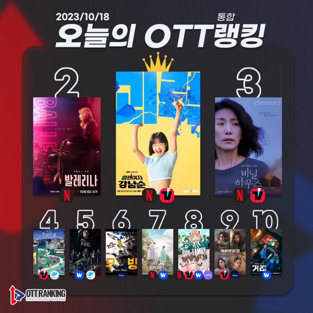 10월 18일 [오늘의 OTT 통합 랭킹] TOP3는 △힘쎈여자 강남순(Strong Woman KangNamSoon) △발레리나(Ballerina) △비닐하우스(Greenhouse)다. 이어 △유괴의 날(The Kidnapping Day) △7인의 탈출(The Escape of the Seven) △무빙(Moving) △오늘도 사랑스럽개(A Good Day to Be a Dog) △스파이 패밀리 2기(SPY × FAMILY) △아라문의 검(Aramun’s Sword: Arthdal Chronicles) △거래(The Perfect Deal) 순으로 차트인했다.