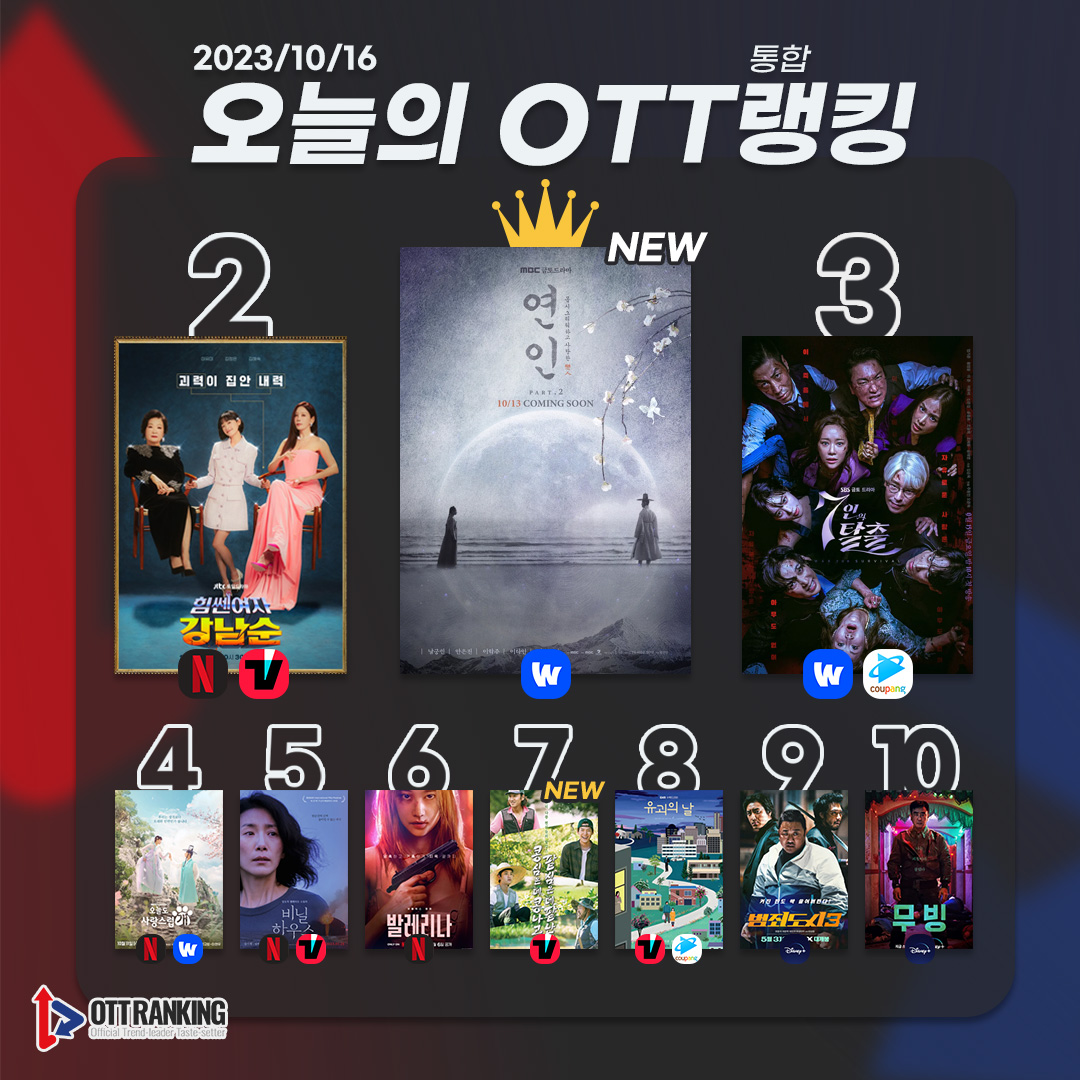 10월 16일 [오늘의 OTT 통합 랭킹] TOP3는 △연인(My Dearest) △힘쎈여자 강남순(Strong Woman KangNamSoon) △7인의 탈출(The Escape of the Seven)이다. 이어 △오늘도 사랑스럽개(A Good Day to Be a Dog) △비닐하우스(Greenhouse) △발레리나(Ballerina) △콩 심은 데 콩 나고 팥 심은 데 팥 난다(Green Bean, Red Bean) △유괴의 날(The Kidnapping Day) △범죄도시3(THE ROUNDUP : NO WAY OUT) △무빙(Moving) 순으로 차트인했다.