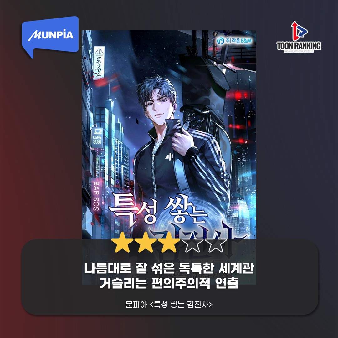 [웹소설 한줄평] 문피아 '특성 쌓는 김전사' 입력 2023-10-14 10:58 수정 2025-08-01 13:47 문피아 시리즈 <특성 쌓는 김전사> ★★★ 나름대로 잘 섞은 독특한 세계관 거슬리는 편의주의적 연출 Previous [첫방D-DAY] 악인이 대세, 아슬아슬한 긴장감으로 그린 19禁 범 Next [웹소설 한줄평] 문피아 '귀신들린 아파트의 주인이 되었다' 관련기사 Romance in 21st Century Grand Prince’s Wife Sparks BuzzElena NovakDrama Review 2025-11-13 19:26 [OTT 한줄평] 영화 '3일의 휴가'Jane RimOTT Online Line Review 2024-03-15 15:41 [OTT 한줄평] 영화 '비밀'Jane RimOTT Online Line Review 2024-03-15 15:40 [OTT 한줄평] 영화 '뜨거운 피'Jane RimOTT Online Line Review 2024-03-15 15:38 [첫방D-DAY] “지금까지 이런 코미디는 없었다”, 이병헌 감독✕류승룡✕안재홍의 ‘닭강정’ (넷플)Jane RimContents 2024-03-15 15:30 [위클리 OTT 랭킹] 3월 2주차 디즈니·쿠팡·왓챠·애플 TOP3 – 스릴과 코믹 사이Jane RimWeekly Top3 2024-03-15 13:49 [데일리 OTT 랭킹] 3/15 웨이브·티빙·넷플 TOP10 – ‘나는 SOLO’ 과몰입의 날안현정Daily Top10 2024-03-15 10:34 [오늘의 OTT 통합 랭킹] 3월 15일 – 설레거나 스릴 있거나Jane RimOTT All Rankings 2024-03-15 10:31 [OTT 영화 랭킹] 3/14 넷플·티빙·웨이브 – 동화 같은 이야기Jane RimMovie Ranking 2024-03-14 15:18 Romance in 21st Century Grand Prince’s Wife Sparks Buzz [OTT 한줄평] 영화 '3일의 휴가' [OTT 한줄평] 영화 '비밀' [OTT 한줄평] 영화 '뜨거운 피' [첫방D-DAY] “지금까지 이런 코미디는 없었다”, 이병헌 감독✕류승룡✕안재홍의 ‘닭강정’ (넷플) [위클리 OTT 랭킹] 3월 2주차 디즈니·쿠팡·왓챠·애플 TOP3 – 스릴과 코믹 사이 [데일리 OTT 랭킹] 3/15 웨이브·티빙·넷플 TOP10 – ‘나는 SOLO’ 과몰입의 날 [오늘의 OTT 통합 랭킹] 3월 15일 – 설레거나 스릴 있거나 [OTT 영화 랭킹] 3/14 넷플·티빙·웨이브 – 동화 같은 이야기 [데일리 OTT 랭킹] 3/14 넷플·티빙·웨이브 TOP10 – 사탕보다 달콤한 [오늘의 OTT 통합 랭킹] 3월 14일 – ‘눈물의 여왕’, 흥행의 제왕! [매거진] 풋풋한 사랑으로 가득 채운 화이트데이 OTT 추천작