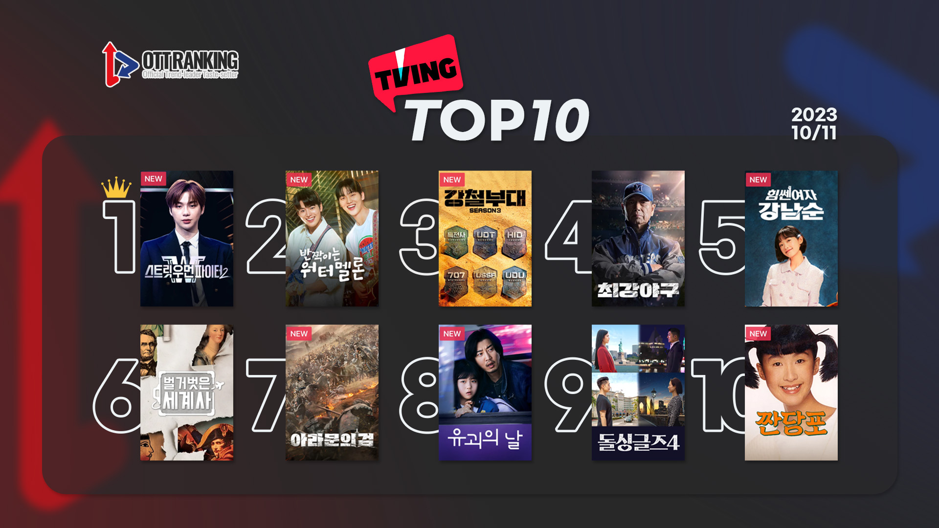 티빙(TVING) 1위는 Mnet <스트릿 우먼 파이터2>(이하 스우파2)다. 10일 방송에서는 가수 화사의 신곡 ‘칠리’(Chili) 안무 창작 미션에 임하는 여섯 크루의 도전기가 그려졌다. 이번 미션의 주요 변수로 꼽혔던 ‘챌린지 가산점’은 원밀리언에게 주어졌고, 결국 원밀리언은 승리 크루가 됐다. 한편 이날 방송 말미에는 결승전으로 향하는 마지막 관문 배틀 퍼포먼스 미션도 공개됐다. 크루 대 크루가 맞붙는 방식으로 진행되는 해당 미션은 직전 퍼포먼스 대중평가 중간 순위에 따라 잼리퍼블릭 vs 레이디바운스, 베베 vs 울플러, 원밀리언 vs 마네퀸으로 대진표가 결정됐다. 화사의 신곡 안무 시안 미션과 배틀 퍼포먼스 미션의 합산 점수를 통해 파이널 진출 4크루가 가려지게 된다. 아시안게임 여파에 1.9%까지 밀려났던 TV 시청률을 다시 2.2%로 회복한 <스우파2>가 파이널 무대까지 거침없는 상승세를 이어 갈 수 있을지 이목이 쏠린다.
