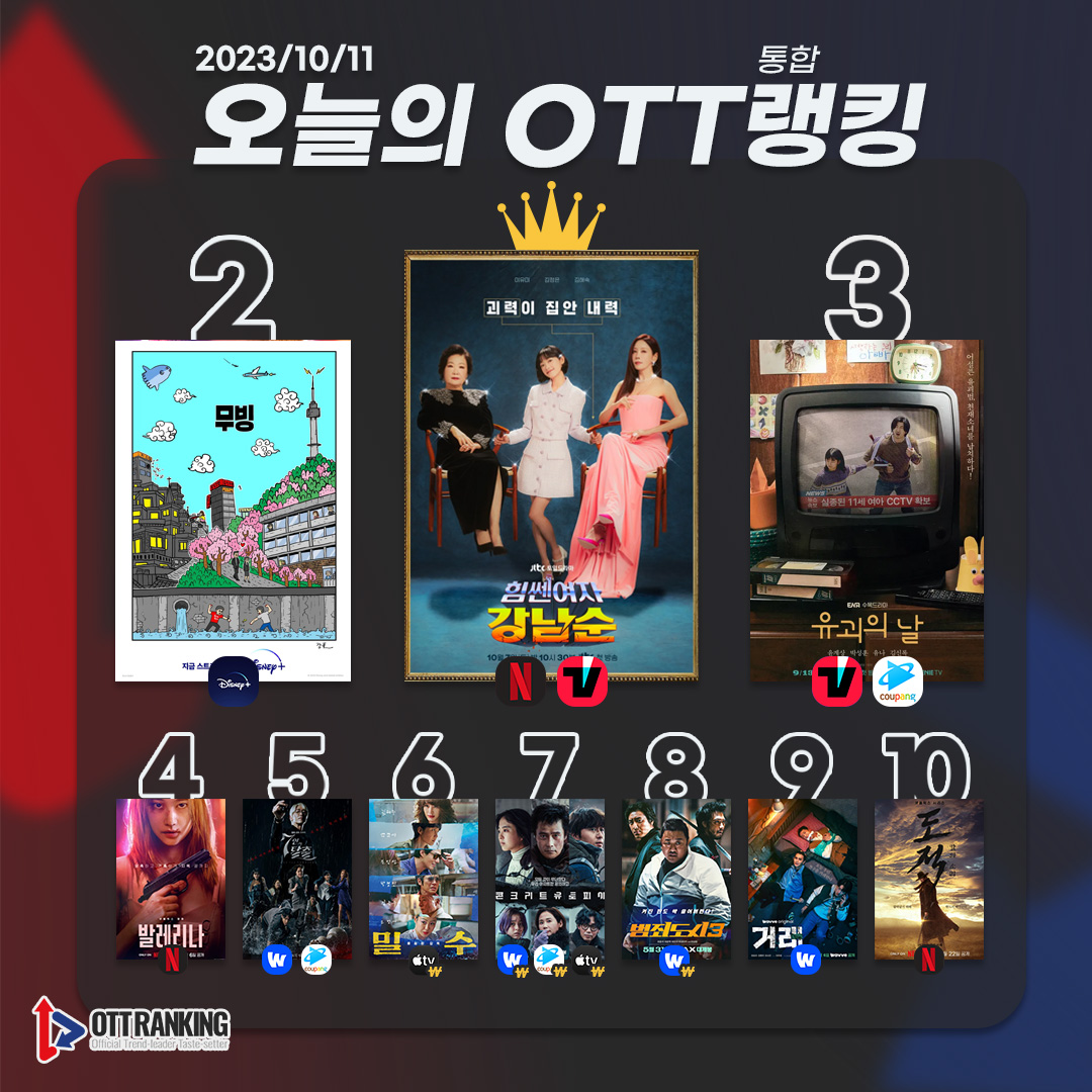10월 11일 [오늘의 OTT 통합 랭킹] TOP3는 △힘쎈여자 강남순(Strong Woman KangNamSoon) △무빙(Moving) △유괴의 날(The Kidnapping Day)이다. 이어 △발레리나(Ballerina) △7인의 탈출(The Escape of the Seven) △밀수(Smugglers) △콘크리트 유토피아(Concrete Utopia) △범죄도시3(THE ROUNDUP : NO WAY OUT) △거래(The Perfect Deal) △도적: 칼의 소리(Song of the Bandits) 순으로 차트인했다.