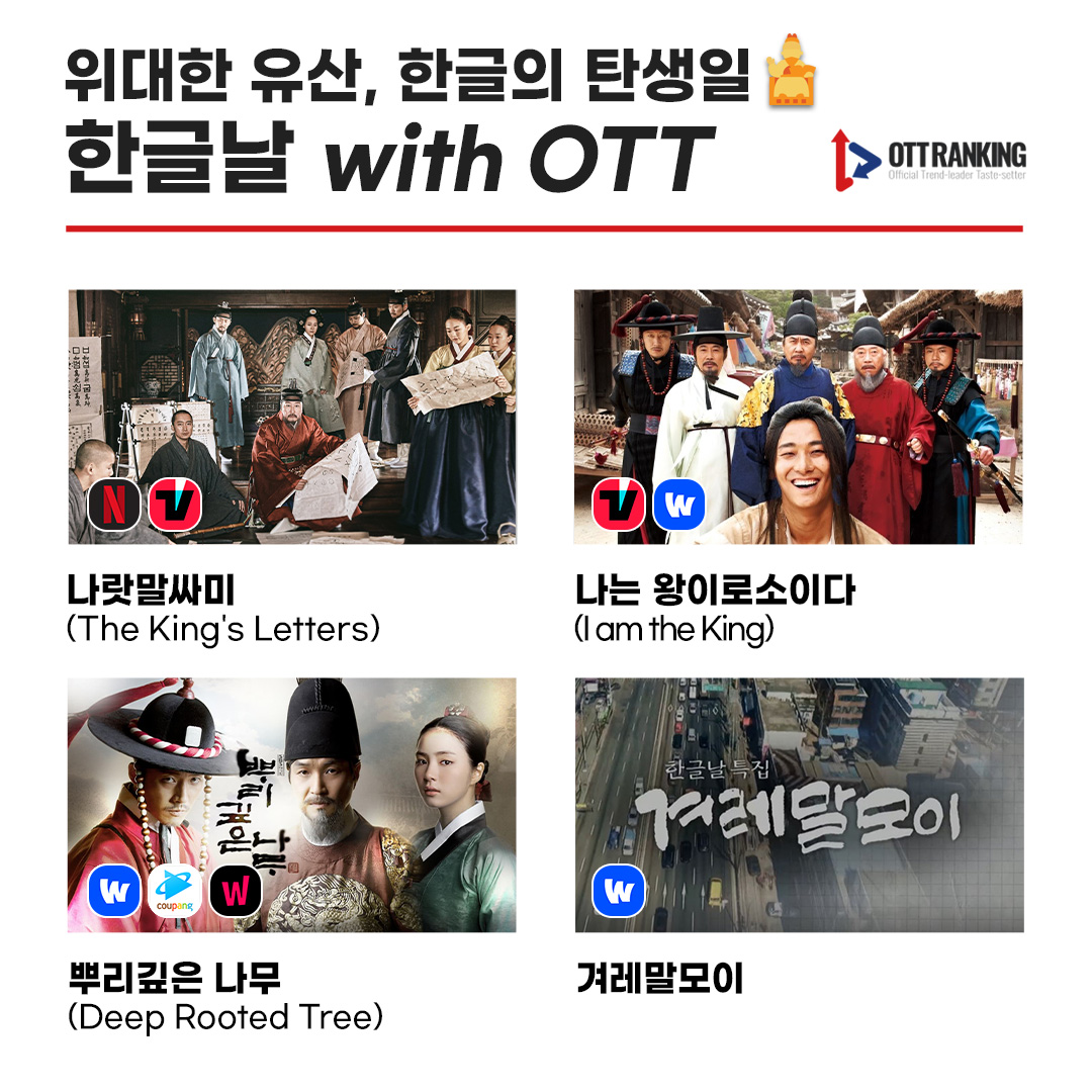 [매거진] 577돌 한글날을 맞이하는 법, 한글날 OTT 추천 Picture Member for 1 year 1 month Real name Sellin Kim Bio 좋은 콘텐츠는 언제나 일상 속 소통과 휴식의 일부분이 됩니다. 누구나 편안하고 즐길 수 있는 콘텐츠로 일상 속 소소한 즐거움을 선사하겠습니다. 입력 2023-10-08 15:00 수정 2025-07-01 11:11 Picture Member for 1 year 1 month Real name Sellin Kim Bio 좋은 콘텐츠는 언제나 일상 속 소통과 휴식의 일부분이 됩니다. 누구나 편안하고 즐길 수 있는 콘텐츠로 일상 속 소소한 즐거움을 선사하겠습니다. Previous [웹소설 한줄평] 문피아 '지나치게 유능했던 악당의 2회차' Next 웨이브, 결국 '디즈니+'에도 밀려나나? 지상파 3사의 초라한 � 관련기사 Romance in 21st Century Grand Prince’s Wife Sparks BuzzElena NovakDrama Review 2025-11-13 19:26 [OTT 한줄평] 영화 '3일의 휴가'Jane RimOTT Online Line Review 2024-03-15 15:41 [OTT 한줄평] 영화 '비밀'Jane RimOTT Online Line Review 2024-03-15 15:40 [OTT 한줄평] 영화 '뜨거운 피'Jane RimOTT Online Line Review 2024-03-15 15:38 [첫방D-DAY] “지금까지 이런 코미디는 없었다”, 이병헌 감독✕류승룡✕안재홍의 ‘닭강정’ (넷플)Jane RimContents 2024-03-15 15:30 [위클리 OTT 랭킹] 3월 2주차 디즈니·쿠팡·왓챠·애플 TOP3 – 스릴과 코믹 사이Jane RimWeekly Top3 2024-03-15 13:49 [데일리 OTT 랭킹] 3/15 웨이브·티빙·넷플 TOP10 – ‘나는 SOLO’ 과몰입의 날안현정Daily Top10 2024-03-15 10:34 [오늘의 OTT 통합 랭킹] 3월 15일 – 설레거나 스릴 있거나Jane RimOTT All Rankings 2024-03-15 10:31 [OTT 영화 랭킹] 3/14 넷플·티빙·웨이브 – 동화 같은 이야기Jane RimMovie Ranking 2024-03-14 15:18 Romance in 21st Century Grand Prince’s Wife Sparks Buzz [OTT 한줄평] 영화 '3일의 휴가' [OTT 한줄평] 영화 '비밀' [OTT 한줄평] 영화 '뜨거운 피' [첫방D-DAY] “지금까지 이런 코미디는 없었다”, 이병헌 감독✕류승룡✕안재홍의 ‘닭강정’ (넷플) [위클리 OTT 랭킹] 3월 2주차 디즈니·쿠팡·왓챠·애플 TOP3 – 스릴과 코믹 사이 [데일리 OTT 랭킹] 3/15 웨이브·티빙·넷플 TOP10 – ‘나는 SOLO’ 과몰입의 날 [오늘의 OTT 통합 랭킹] 3월 15일 – 설레거나 스릴 있거나 [OTT 영화 랭킹] 3/14 넷플·티빙·웨이브 – 동화 같은 이야기 [데일리 OTT 랭킹] 3/14 넷플·티빙·웨이브 TOP10 – 사탕보다 달콤한 [오늘의 OTT 통합 랭킹] 3월 14일 – ‘눈물의 여왕’, 흥행의 제왕! [매거진] 풋풋한 사랑으로 가득 채운 화이트데이 OTT 추천작