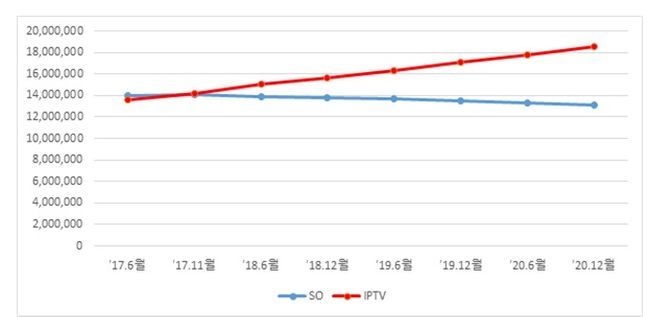 반대로 OTT 서비스 이용률은 날이 갈수록 높아지고 있다. 방송통신위원회에 따르면 2017년 35.0%에 불과하던 OTT 서비스 이용률은 2020년 66.3%로 3년 새 2배 가까운 성장을 일궈냈다. 방통위 관계자는 "OTT 가입자가 급증하면서 IPTV의 VOD 매출이 감소하는 등 유료 방송 업계 내의 경쟁 압력이 증가하는 것으로 보인다”고 설명했다. 이는 케이블TV도 마찬가지다. 케이블TV 업계는 IPTV와 OTT 양측에 짓눌려 고사 위기에 처했다. 가입자 수 격차가 지속적으로 벌어지고 있는 가운데 인수합병(M&A) 시장에서조차 외면받고 있기 때문이다.