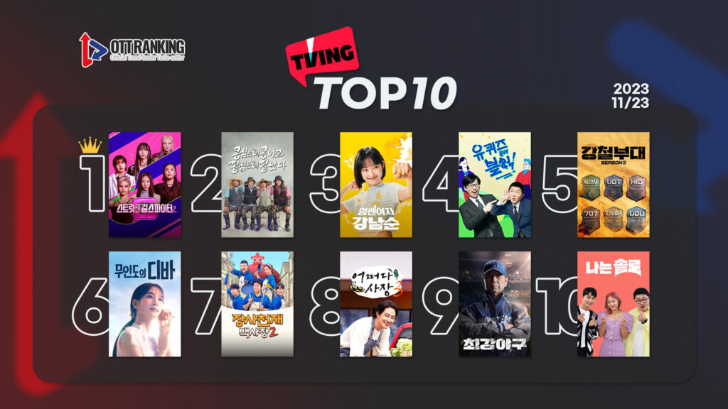 티빙(TVING) 1위는 전날 6위로 처음 차트에 모습을 드러낸 Mnet <스트릿댄스 걸스 파이터2>(이하 스걸파2)가 차지했다. 대한민국을 넘어 전 세계 댄스신을 장악할 10대 댄서 발굴을 향한 여정을 그린 이 프로그램은 전 시즌과 달리 글로벌로 무대를 넓히며 전 세계 10대 댄서들의 패기 넘치는 무대를 예고해 눈길을 끌었다. 댄스 열풍의 시초가 된 <스트릿 우먼 파이터>의 주역 아이키, 가비, 바다, 리아킴, 커스틴, 펑키와이 등 초호화 마스터 군단 또한 많은 시청자가 꼽은 관전 포인트. 지난 21일 첫 방송 후 시청자들은 “확실히 10대들이라 패기가 남다르다”, “앞으로가 더 기대되는 친구들이 많이 보인다”며 열띤 반응을 보였다. 전 시즌에 참가했던 박혜림(하리무), 조나인 등이 큰 화제를 모으며 화려하게 댄스신에 데뷔한 만큼 이번 시즌 스타 탄생에도 많은 기대가 모인다.