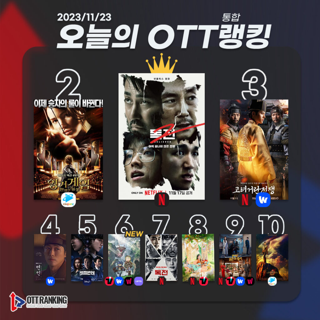 11월 23일 [오늘의 OTT 통합 랭킹] TOP3는 △독전2(Believer 2) △헝거게임: 판엠의 불꽃(The Hunger Games) △고려 거란 전쟁(Goryeo-Khitan War)이다. 이어 △연인 파트2(My Dearest) △비질란테(Vigilante) △메이드 인 어비스(Made in Abyss) △독전(Believer) △무인도의 디바(Castaway Diva) △완벽한 결혼의 정석(A Perfect Marriage) △헝거게임: 캣칭 파이어(The Hunger Games: Catching Fire) 순으로 차트인했다.