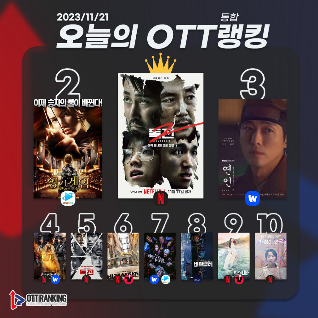 11월 21일 [오늘의 OTT 통합 랭킹] TOP3는 △독전2(Believer 2) △헝거게임: 판엠의 불꽃(The Hunger Games) △연인 파트2(My Dearest)다. 이어 △고려 거란 전쟁(Goryeo-Khitan War) △독전(Believer) △비공식작전(Ransomed) △7인의 탈출(The Escape of the Seven) △비질란테(Vigilante) △무인도의 디바(Castaway Diva) △정신병동에도 아침이 와요(Daily Dose of Sunshine) 순으로 차트인했다.