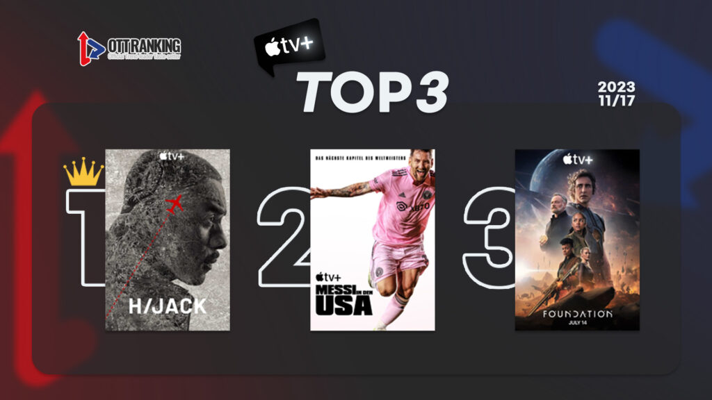 애플TV+(AppleTV Plus) 1위는 오리지널 시리즈 <하이재킹 Hijack>이다. 두바이에서 런던으로 가는 비행 도중 공중 납치가 이뤄지고, 기업 전문 교섭자인 샘 넬슨(이드리스 엘바 분)이 탑승객들을 구하기 위해 고군분투하는 이야기를 담은 이 작품은 쫄깃하고 긴장감 가득한 스토리로 국내 시청자들을 사로잡으며 지난 8월 종영 후 세 달이 지난 지금까지 차트 왕좌를 지키고 있다.