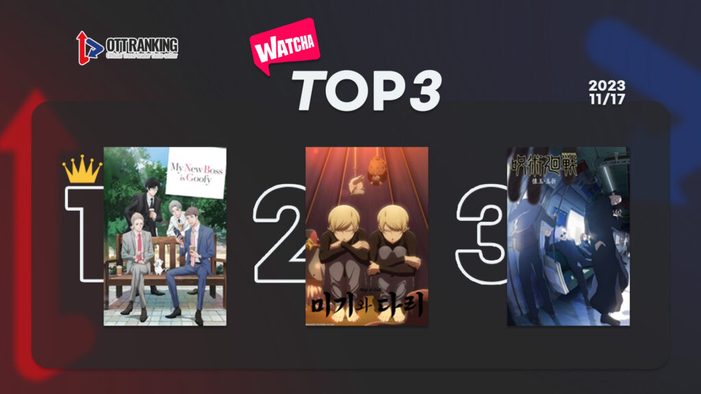 왓챠(WATCHA) 1위는 지난 10월 7일 첫 방송을 시작한 일본 TV 애니메이션 <새로운 상사는 귀여운 허당 My New Boss Is Goofy>이다. 동명 만화를 원작으로 상사의 갑질 때문에 전직하게 된 주인공과 귀여운 허당 캐릭터의 새로운 상사가 펼치는 이야기를 담은 이 작품은 엉뚱하지만 귀엽고 유쾌하면서도 잔잔한 힐링을 주는 스토리로 BL 장르임에도 폭넓은 시청자들에게 주목받으며 순항 중이다.