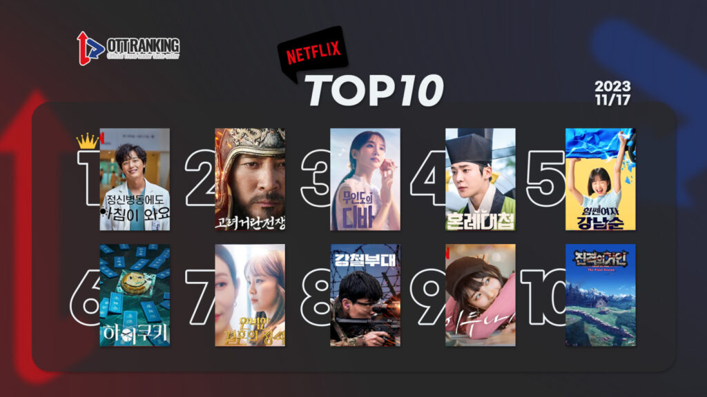 넷플릭스(Netflix) 차트는 큰 변화 없이 주말을 맞게 됐다. 오리지널 시리즈 <정신병동에도 아침이 와요>의 왕좌 수성이 이어진 가운데 KBS2 토일극 <고려 거란 전쟁>과 tvN 토일극 <무인도의 디바>가 나란히 그 뒤를 이으면서다. 전날 5위를 기록했던 KBS2 <혼례대첩>은 4위에 있던 JTBC 토일극 <힘쎈여자 강남순>과 자리를 바꿨고, U+모바일tv 오리지널 드라마 <하이쿠키>는 한 계단 올라 6위에서 상위권 재진입을 노리고 있다.