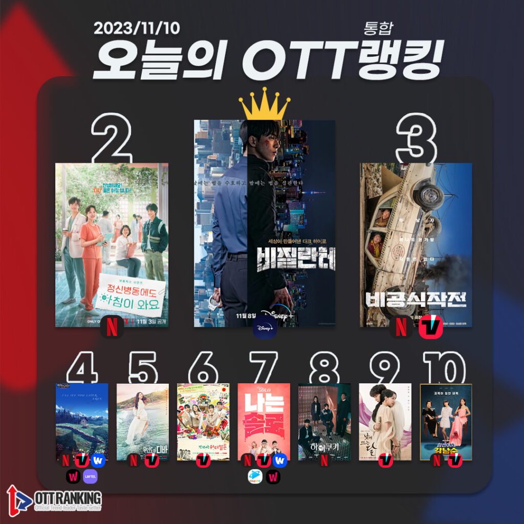 11월 10일 [오늘의 OTT 통합 랭킹] TOP3는 △비질란테(Vigilante) △정신병동에도 아침이 와요(Daily Dose of Sunshine) △비공식작전(Ransomed)이다. 이어 △진격의 거인 The Final Season 완결편 후편(Attack on Titan The Final Season) △무인도의 디바(Castaway Diva) △반짝이는 워터멜론(Twinkling Watermelon) △나는 SOLO(I’m SOLO) △하이쿠키(High Cookie) △낮에 뜨는 달(Moon in The Day) △힘쎈여자 강남순(Strong Woman KangNamSoon) 순으로 차트인했다.