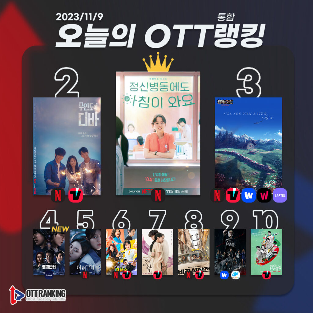 11월 9일 [오늘의 OTT 통합 랭킹] TOP3는 △정신병동에도 아침이 와요(Daily Dose of Sunshine) △무인도의 디바(Castaway Diva) △진격의 거인 The Final Season 완결편 후편(Attack on Titan The Final Season)이다. 이어 △비질란테(Vigilante) △하이쿠키(High Cookie) △힘쎈여자 강남순(Strong Woman KangNamSoon) △낮에 뜨는 달(Moon in The Day) △비공식작전(Ransomed) △7인의 탈출(The Escape of the Seven) △반짝이는 워터멜론(Twinkling Watermelon) 순으로 차트인했다.