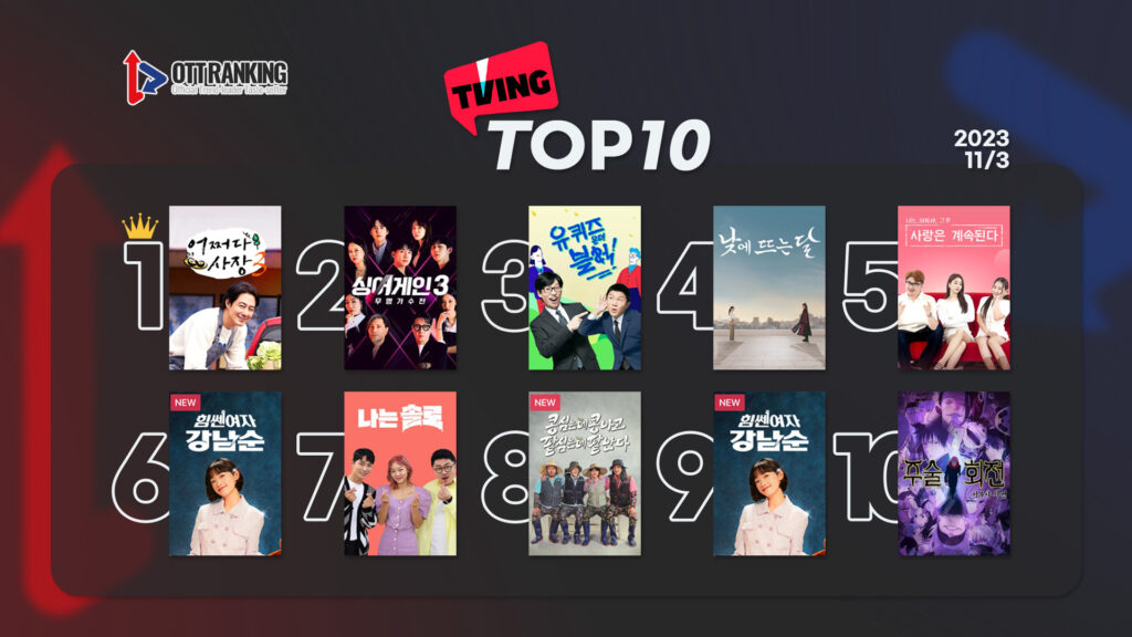 종영한 Mnet <스트릿 우먼 파이터2>는 6위에서 여운을 만끽 중이며, 이광수-김우빈-도경수-김기방의 코믹 다큐 밭캉스 tvN <콩 심은 데 콩 나고 팥 심은 데 팥 난다>는 8위를 기록했다. JTBC 토일극 <힘쎈여자 강남순>은 9위에서 숨을 돌리고 있고, 10위에는 일본 애니메이션 <주술회전-시부야사변>이 이름을 올렸다.