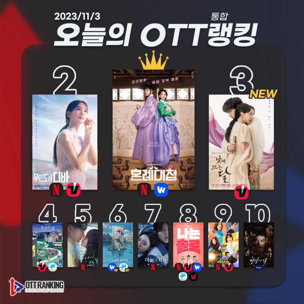 11월 3일 [오늘의 OTT 통합 랭킹] TOP3는 △혼례대첩(The Matchmakers) △무인도의 디바(Castaway Diva) △낮에 뜨는 달(Moon in The Day)이다. 이어 △유괴의 날(The Kidnapping Day) △이두나!(Doona!) △스즈메의 문단속(Suzume) △하이쿠키(High Cookie) △나는 SOLO(I’m SOLO) △힘쎈여자 강남순(Strong Woman KangNamSoon) △최악의 악(The Worst of Evil) 순으로 차트인했다.
